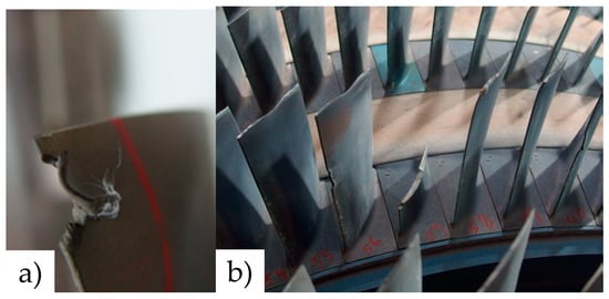 Foreign Object Damage (FOD) and Domestic Object Damage (DOD) refer to damage caused by impact with objects from the external environment and from the GT itself, respectively. For example, FOD can be caused by impact with ingested birds, ice, stones, debris, and gravel on runways, while DOD can be caused by impact with fragments detached from blades or large carbon particles from the fuel nozzles []. FOD and DOD damages are comprised between nonrecoverable (with washing) fault and a catastrophic engine fault []. FOD is one of the biggest problems and can lead to catastrophic failures []. The effects on performance primarily focus on the efficiency variation of the affected component. The changes in flow capacity depend on how the objects causing the FOD/DOD interact with the component. If the impact results in a lost blade, flow capacity increases, while if the object gets stuck and obstructs the flow, flow capacity decreases []. The cases shown in Figure 7, both taken from [], depict damage that is typically due to the impact with a sharp object (a) and the breaking of a blade of a HPC (b).