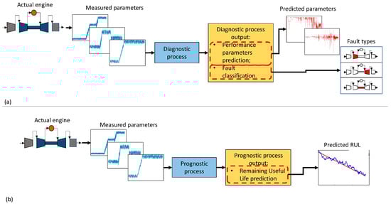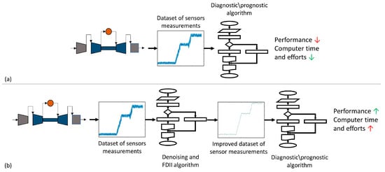 Difference between two approaches: (a) Diagnostic/prognostic algorithm informed with pure sensor measurements; (b) Diagnostic/prognostic algorithm informed with improved sensor measurements.