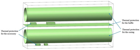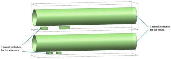 - For accessory 2 without an internal heat source, the thermal protection effect of adding a heat insulation layer to the casing and fuel cooling simultaneously was the most ideal, which caused the temperature of accessory 2 to decrease by 190 K. Moreover, the effect of adding a heat insulation layer to the casing was more significant in accessory 2 without an internal heat source.