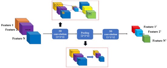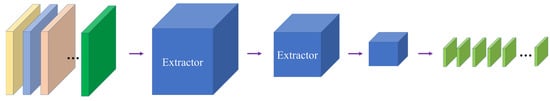 This structure is designed and refers to the encoder part of the VGG network []. But our field data has 3 dimensions in shape; thus, we upgrade the convolution layers from 2D to 3D [], as shown in Extractor modules in Figure 3. Precisely, it extracts features from three directions, such as a cube. To be specific, this part consists of multiple Extractor modules, each of which is constructed by one pooling layer and two 3D-convolution layers followed by the Leaky Relu function [] as an activation function. Meanwhile, two convolutional layers share different convolution kernel sizes for multi-scale abstraction. Precisely, the larger-size convolution kernel increases the number of features, while the smaller size convolution kernel improves the mapping ability. Plus, the middle pooling layer reduces the dimension and results in stacking features in multi-scales. After multiple extractors, the input data will be fully compressed and amplified. In practice, the field data is compressed to a scale of 3 × 3 × 3, and its number of channels increases to 256.