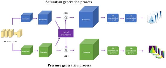 The decoder network is constructed to generate a saturation field and pressure field according to the hidden features calculated by the encoder part above. The entire network contains 3 functional modules, namely the generator module, the model distillation module [] and the GRU module [], as shown in Figure 4. To be specific, the generator module restores the size to the original size. Then, the distillation module accomplishes the interaction between the oil saturation field and pressure field in Equation (7). Finally, the GRU module combines shared features and independent features into complete intrinsic features for each field.