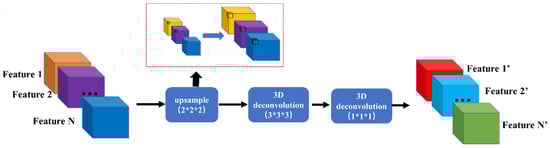 In detail, the generator module consists of three parts and its structure is shown in Figure 5. The first part is up-sampling processing, which is to expand the size of the three-dimensional field. The second and third parts are deconvolution processing, which is the reverse of the convolution operation mentioned earlier and the size of kernels changes corresponding to the encoder. Another module is named model distillation, which merges features from two fields and generates the interactive features back for them. This module can be constructed in many ways and here we perform a naive concatenation of the feature followed by two 3D convolution layers with kernel size 1 by 1 by 1. The third module GRU contains many formulae (Equations (16)–(19)) or fuses the distilled interactive features into the original branch so that they will include both mutual effects and their unique properties. Finally, the two-layer convolution works for a better fit. In addition, the activation functions of the last two layers of networks are set to Tanh() [] and Sigmoid() [].