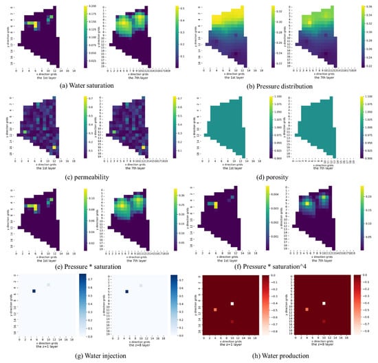 First, we do the normalization process by scaling original input features into the range of [0,1]. Then, we transform sparse data, such as well features, into dense form (field data) to represent well-local information until all well-based information is turned into field type. For example, for the well position feature, if a grid has a well, it shows different values from others that do not have one. Then, the features are composed into many groups as amplified features. Detailed results of feature engineering are shown in Figure 8.