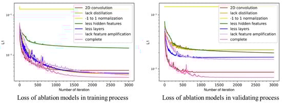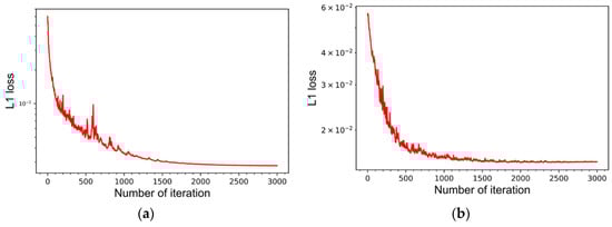 We used the absolute error () as our loss function, which measures the absolute error between the target results and prediction values, as shown in Equation (20). We also found that L2 leads to blurred predictions. In addition, it should be noted that the sampling method of the weight parameters has a great influence on the result, and the experimental results show that it is easier to jump out of the range of the local optimal solution to realize the initialization of the weight by using Gaussian distribution.