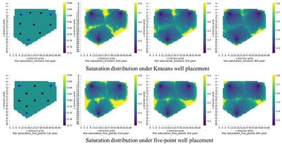 Methods for obtaining a saturation field are mainly divided into three kinds. One is to calculate using formulae. Leverett predicted the static saturation distribution for whole reservoirs [] according to the oil saturation–height function. Another example is Archie, who makes use of the formation resistivity and porosity to calculate water saturation []. In recent years, the most commonly used method has been the flow unit [] and EWU [] model, which calculates the seepage rate and drainage efficiency between wells. Because their calculation formula is relatively simple, the calculation speed is very fast.