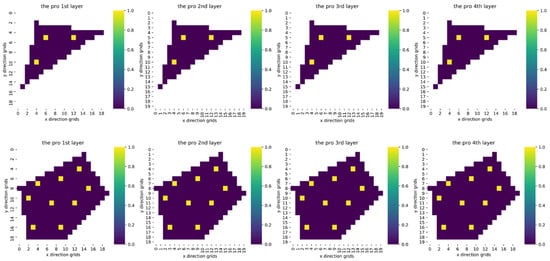 Combining Equations (11)–(14), we can draw three conclusions. First, if we want to get the oil saturation and at a later time step, seven variables and their combinations from the previous time step are needed, including the permeability field , saturation at the previous step and at the current step , pressure at the previous step and at the current step, the production and injection volume of the well and , and some further non-linear combinations. Second, the power of is difficult to determine. When time goes by, the range of network diffusion gradually increases, leading to the number of being non-stationary. Third, in these implicit equations, saturation and pressure integrate together in a very complex way, making it difficult to calculate by analytical methods.