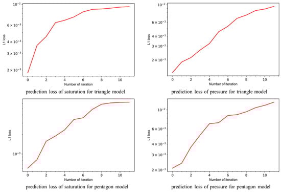 After obtaining the oil saturation field and pressure field predicted by the network, we apply the L1 loss function mentioned above to calculate the error between the predicted result and the labeled result. Specifically, in the training mode, we apply the Adam algorithm [] to calculate the gradient information of parameters in the network and further update them given an assigned learning rate.