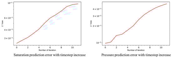 We show the loss of both training data and validating data in the training mode and further analyze the contribution of inner modules embedded in the network based on the loss curve [,,]. When it comes to application, we do a prediction of saturation and pressure field in future 9 timesteps from a random reservoir state and show the trend of the error between the predicted field and real ones.