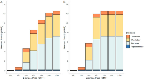 The challenges of balancing economic growth and environmental sustainability have been on the rise in China, particularly among the most economically developed provinces such as Jiangsu. Coal–biomass co-firing generation has been promoted by the state government in a series of political documents (e.g., the National 13th Five-Year Plan). However, its development has been much slower in recent years than that of other renewable energies, such as solar and wind power, largely due to policy uncertainty. State and local governments usually hesitate to keep promoting large-scale biomass co-firing because of the unstable biomass supply and induced land-use change issues that may threaten food security. In contrast to previous studies focusing on the technical supply potential of residue-based biomass [17], our results indicate that biomass prices of USD 50/MT would be required to incentivize farmers to collect crop residues and supply them for biopower purposes. About 12.5 M MT of biomass is economically viable when the price is as high as USD 100/MT, with 56% of biomass being rice straw. Our results for the maximum feasible biomass supply are substantially smaller than the theoretical potential estimated by previous studies, which overlooked the economic incentives and co-firing capacity, and are comparable with the estimated sustainable potential (15 M MT) by [17].