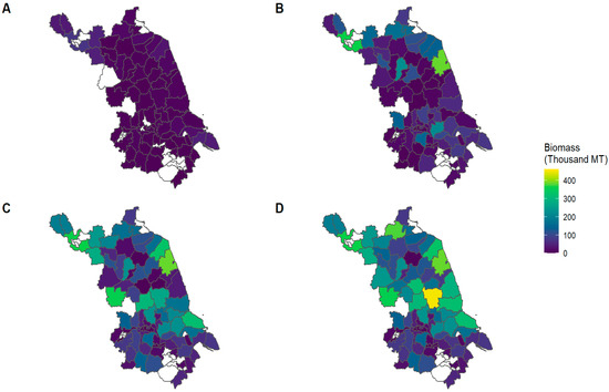 Spatial distribution of feedstock production for alternative levels of biomass price with a 10% co-firing rate: (A) USD 50/MT; (B) USD 60/MT; (C) USD 70/MT; (D) USD 80/MT.