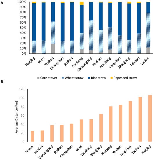 Biomass supply mix and average biomass hauling distances by facilities located in 13 cities at USD 80/MT biomass price and 10% co-firing rate: (A) Supply mix of biomass by city; (B) Average biomass transportation distance by city.