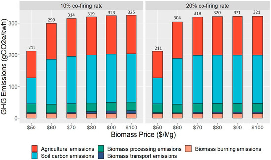 We used the mathematical programming model for co-fired biomass production combined with the life cycle emissions to calculate the GHG emissions with residue-based electricity generation under various biomass price scenarios at two co-firing rate levels. Instead of reporting the absolute GHG emissions, reporting emissions per kWh of electricity makes a clearer comparison with coal-based electricity. As shown in Figure 6, the total GHG emissions increase with an increase in biomass price and range between 211 and 325 g CO2e/kWh for the USD 50–USD 100/MT range of the biomass price with a 10% co-firing rate. The corresponding estimate of the GHG emissions with a 20% co-fired biomass range is between 211 and 321 g CO2e/kWh, for the same range of the biomass price. The total GHG emissions are broken down into several components based on the different stages of bioelectricity generation. Removal of crop residues from fields leads to a soil carbon loss. The net GHG emissions associated with soil carbon change were estimated to range between 82 and 153 g CO2e/kWh for a USD 50–USD 100/MT biomass price with a 10% co-firing rate. The GHG emission associated with agricultural production includes the emission incurred from feedstock production at the farm gate. This was calculated by multiplying the energy use in the planting, maintaining, and harvesting of residues and row crops (relative to the zero-biomass price case) by the corresponding emission factors (in g CO2e per unit of energy input). The emissions in this sector vary between 85 and 122 g CO2e/kwh for a USD 50–USD 100/MT biomass price. The emissions from biomass processing contributed about 27 g CO2e/kwh across all price scenarios, representing 9% of the total emissions. The changes in the soil organic carbon and above-ground emissions during the biomass-producing process are key determinants of the overall GHG emissions of bioelectricity; together, they contribute about 86% of the total GHG emissions. The GHG emissions from biomass transportation increase with the biomass price, as fuel consumption (i.e., diesel) increases with a longer transportation distance. They range between 3.1 and 9.1 g CO2e/kwh at a biomass price of USD 50–USD 100/MT. The last stage is burning biomass for electricity generation, which results in 13.9 g CO2e/kwh emissions to the atmosphere. It is worth noting that we assume that the carbon content in residue biomass is biogenic and, therefore, carbon-neutral, which is consistent with the existing literature [44,46]. The GHG emissions under a 20% co-firing rate scenario show a very similar proportion for each sector (Figure 6). Our findings are consistent with the results from prior studies, which showed that the GHG emissions of crop-residue-based electricity range between 235 and 325 g CO2e/kwh [23,46]. As a reference, the GHG emissions for China’s coal-fired and natural-gas-fired electricity were about 1230 g CO2e/kwh and 856 g CO2e/kwh, respectively [45]. In general, the results affirm that biopower leads to substantially lower GHG emissions than fossil-fuel-based electricity.