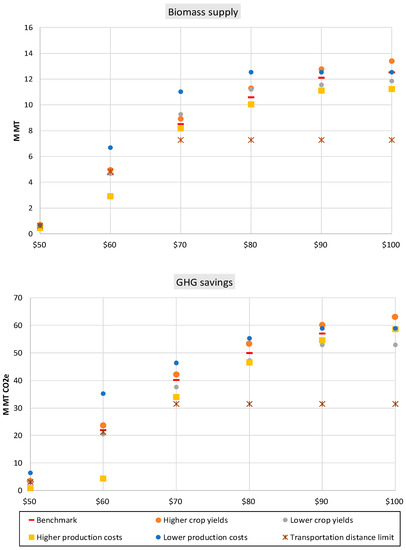 We examined the sensitivity of our findings to several key parameters that affect the productivity of the land, the ease of residue collection, and transportation. Specifically, we considered the effects of major crop yields (corn, rice, wheat, and rapeseed) at ±10% of the benchmark level. We also examined the sensitivity results with 10% higher and lower production costs for the crop residues. Additionally, we considered the possibility that the feedstock transportation distance is no more than 75 km (one way). We found that the biomass supply is most sensitive to assumptions about the crop residue production costs, crop yields, and transportation distance (Figure 7). The effects of these parameters are not uniform across all the biomass price levels. At the relatively lower biomass prices of USD 50–USD 80/MT, a 10% increase in residue production costs (including the costs of extra fertilizer, collection, and processing) could lead to a 5% to 37% decrease in the biomass supply, while a 10% decrease in the residue production costs could increase the biomass supply by 18% to 44% relative to the benchmark case. At the relatively higher biomass prices of USD 90–USD 100/MT, the biomass availability is most sensitive to crop yields and transportation distance; a 10% higher crop yield increases the amount of the biomass supply by 5% to 7%, while the inclusion of a restriction on transportation distance decreases the biomass supply by 38% to 42%. The total economic supply potential is estimated to range between 0.4 and 13.4 M MT across all sensitivity scenarios.