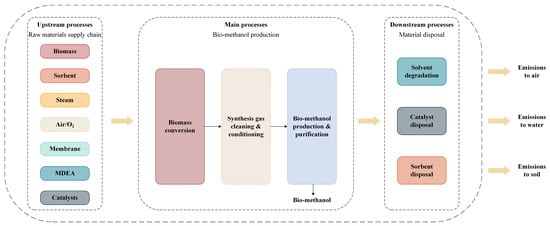 The system boundaries are referred to as the interface between the set of unit processes under investigation and environment. Based on the goal of the study, there are four options to define the limits of the system: (i) cradle-to-grave, (ii) cradle-to-gate, (iii) gate-to-gate, and (iv) gate-to-grave. The present work is a cradle-to-gate LCA study, as it covers all production steps from the raw materials supply chain (i.e., biomass) up to the finished product (i.e., bio-methanol).