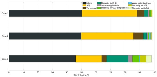 The detailed distribution of the GWP impact category for all CONVERGE technology scenarios is displayed in Figure 3. As illustrated, Milena (i.e., gasification section) followed by SER section show the highest influence on the GWP impact in either of the three evaluated cases. When looking at Case 1, Milena contributes with approximately 50% to the total share, releasing around 718 kg CO2 eq./tMeOH, while the SER section generates 544 kg CO2 eq./tMeOH as gaseous emissions. Therefore, about 89% of the total greenhouse gas emissions in Case 1 are due to the two processes. Tar removal and electricity generation for the electrochemical H2 compression rank as third and fourth contributors, respectively. Similar to Case 1, Milena and SER section remain the main greenhouse gas sources with a combined share of nearly 86% of the total emissions released in Case 2 (i.e., 641 kg CO2 eq./tMeOH are produced from Milena and 462.641 kg CO2 eq./tMeOH are released from SER). Compared to Case 1, tar removal and electricity generation for electrochemical H2 compression show slightly higher contributions, 6.90% and 2.29%, respectively.