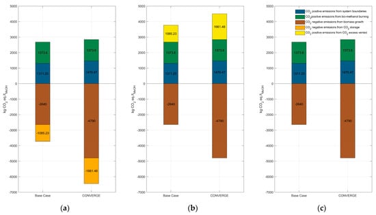 Depending on the fate of the separated CO2 from the AGR (i.e., for Base Case) and the CO2 separated from SER and CO2 compression in the CONVERGE case, two more scenarios can be approached. On the one hand, if the separated CO2 is released into the atmosphere, the scenario depicted in the middle part of Figure 4, the total CO2 eq. released would be around 1130.08 kg CO2 eq./tMeOH for the BC and −284.45 kg CO2 eq./tMeOH for the CONVERGE case. The negative emissions obtained in the CONVERGE scenario are due to a higher quantity of biomass required as compared to the Base Case. On the other hand, the separated CO2 can be considered as a valuable by-product and, therefore, it can be sold (see Figure 4). As a result, it can be considered close to zero emissions from the AGR section, as well as from the SER and CO2 compression. These assumptions lead to a total of nearly 44.85 kg CO2 eq./tMeOH and −1945.93 kg CO2 eq./tMeOH for the Base Case and CONVERGE technology, respectively.