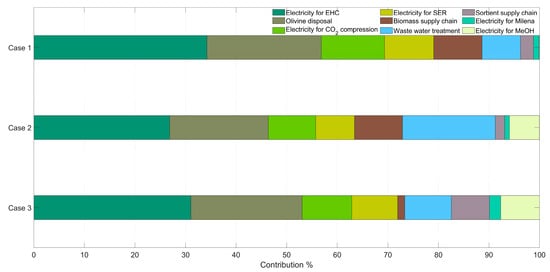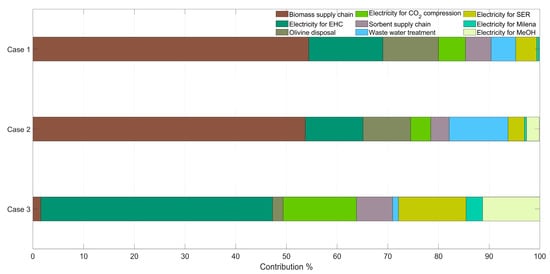 Figure 5 shows the main sub-processes contributing to the FDP score for each evaluated scenario. For the two wooden biomass scenarios (i.e., Case 1 and Case 2), the biomass supply chain, particularly the diesel consumption within various steps of the biomass pre-processing, contributes the most. For Case 1, more than half (i.e., 54.41%) of the total of 31.24 kg oil eq./tMeOH is brought by the biomass supply chain. The electricity generation for H2 compression is followed by olivine disposal rank second and third contributors, respectively (i.e., 14.60%, and 10.98%). In the second case, Case 2, the biomass supply chain remains the primary contributor with a 53.73% share, while the wastewater treatment section and electricity production for H2 compression rank second and third, respectively. For the Case 3 using exhausted olive pomace, the electricity generation for several sections, such as electrochemical H2 compression, CO2 compression, SER and the methanol synthesis section, present the highest influence, since the grid mix, when assessing Italy as plant location, is mainly based on fossil fuels.