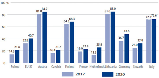 The largest increases were in the Netherlands (12.5 p.p.), Germany (10.9 p.p.), and Slovakia (7.8 p.p.) (Figure 1). In 2020, in Poland, the share of renewable energy in total primary energy was 21.6%, while in the EU-27, it was 40.7%. The average annual growth rate of this indicator in 2017–2020 was 14.7% in Poland and 7.5% in the EU-27.