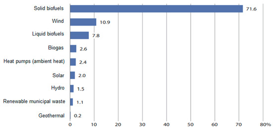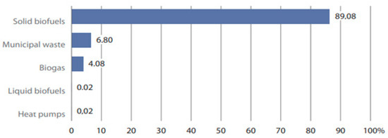 From 2017 to 2021, there was an increase in heat production from renewable energy carriers to 23,511.4 TJ in 2021 (Figure 4). It should be noted that in 2017–2021, the share of solid biofuels in heat production remained at a similar level (the share in 2017 was 89.6%, and in 2021, the share was 89.08%). At the same time, there was a 3.3 p.p. increase in biogas and renewable municipal waste energy production (from 457 TJ in 2017 to 1599 TJ in 2021).