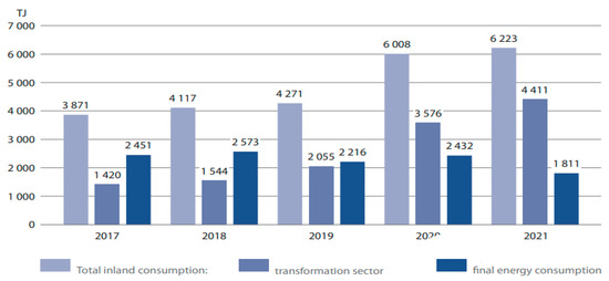 The energy balance of biodegradable municipal waste is shown in Table 1. Between 2017 and 2021, there was a 60.8% increase in total domestic consumption (from 3871 TJ to 6223 TJ) and a 26.1% decrease in final consumption (from 2451 TJ to 1811 TJ). During the years in question, the largest increase in final consumption was recorded in trade and services (by 815%), while the mineral industry recorded a decrease of 98%. In addition, there was a more than three-fold increase in energy consumption per energy conversion input (from 1420 TJ to 4411 TJ) in industrial and commercial thermal power plants.