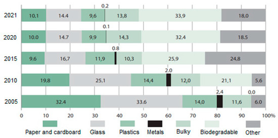 According to a morphological composition survey conducted in 2021 by the Institute of Environmental Protection, it was found that the highest share was reached by kitchen waste (18.3%). Another significant share was found for plastics (16.1%). Paper waste accounted for 12.8% and garden waste accounted for 11.8%. In the range of 5–10%, shares of morphological components were recorded for glass waste “other categories” and fractions < 10 mm. Analysis of the morphological composition of the category of paper waste accepted at municipal facilities confirmed the dominance of cardboard (almost 40%). Half the share was recorded for the fraction of other non-packaging paper (22.7%). The share of other subcategories was recorded at almost 20%. Analysis of the morphological composition of the category of plastic waste in mixed municipal waste showed that, of the subcategories highlighted, high-density polyethylene (PE-HD) and low-density polyethylene (PE-LD) film dominated at 45%. A much lower share was obtained by the polypropylene and polystyrene fraction (16.1%). Shares of less than 10% were found for the following: clear PET; household chemical packaging; other non-packaging; and blue PET. The lowest contents at 1.9% were obtained for green PET and PET mix. The share of colorless glass packaging in the main category of glass waste was almost 60%. The share of brown glass packaging was shown to be 22.7%, and other glass packaging was shown to be 18.6%. On the other hand, in the category of metal waste, the highest share was obtained for iron packaging (45.5%) and 40.9% for aluminum packaging.