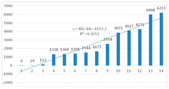The test value of the null hypothesis was t = 11.946. The result obtained was confronted with the critical value read from the tables of Student’s t-distribution at the confidence level α = 0.05 and 12 degrees of freedom, which was t0.0515 = 2.179. Thus, the null hypothesis Ho was rejected in favor of the alternative hypothesis H1 because the test value of the null hypothesis is greater than the critical value read from the tables of Student’s t-distribution (11.946 > 2.179). The trend coefficient was statistically significant, confirming the presence of a trend in the time series under study.