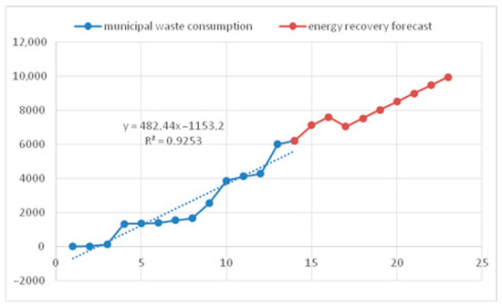 Tackling climate change, implementing the principles of sustainable development and a closed-loop economy, and creating an economically and environmentally efficient waste management system are the most serious environmental and economic challenges today. One of the biggest problems with waste is that it causes water, soil, and air pollution. The combination of precipitation and septic processes produces leachates containing heavy metals and acids, which negatively affect surface and groundwater, changing their composition and pH, among other things. According to the Polish waste database, there are more than 2500 waste incineration plants operating worldwide, including more than 500 in Europe, while there are 8 in Poland. The concept of a closed-loop economy is based on the rational use of resources, i.e., less consumption of raw materials and energy by creating a closed loop of processes in which waste becomes raw materials in subsequent production stages. The aim of this study was to develop forecasts of electricity recovery from municipal waste using a prediction method based on an approximating function. The predictions made show that in 2023, the forecast of energy recovery from biodegradable municipal waste will be 6566 TJ. Projections of energy recovery from municipal waste for the future are steadily increasing, with planned recovery in 2030 at 9943 TJ.