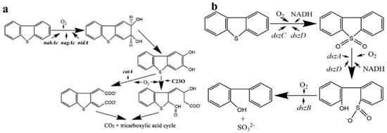 Functional genes for the degradation of DBT (dibenzothiophene) by the Kodama pathway and the 4S pathway. (a) Kodama pathway; (b) 4S pathway [56]. Permission obtained through Rights Link®.