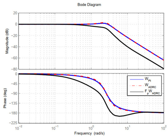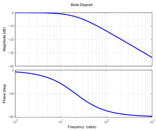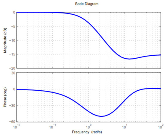 Since is a low-pass filter, has a similar Bode diagram with in low-frequency. A typical Bode diagram of is drawn in Figure 6 with a red dash–dot line. It also has a peak in the magnitude-frequency plot.