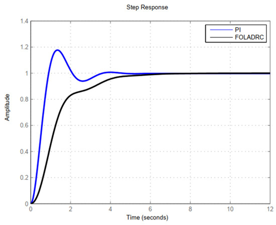 Typical step responses of FOLADRC and PI control. The parameters are: , , , . The plant .