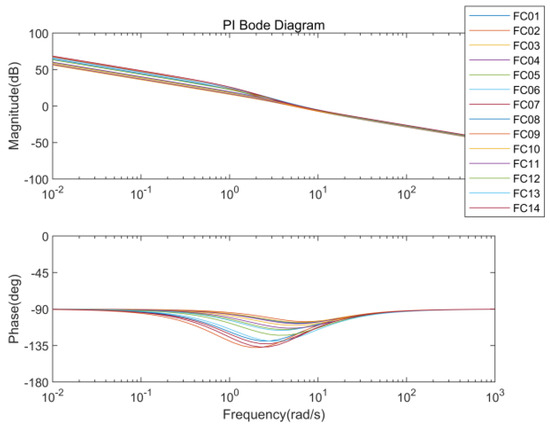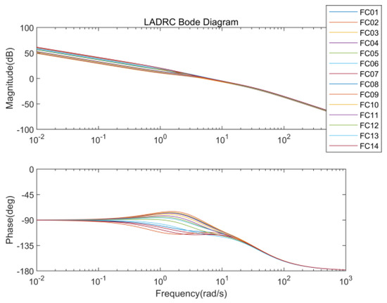 With Figure 2a, the stability of the FOLADRC system depends on the closed-loop made of and the plant. To analyze the stability, we draw the Bode diagrams of in Figure 8, while the PMs and the gain crossover frequencies are listed in Table 1. To compare, PI control (22) is also used for the 14 linearized models as shown in Figure 3. Bode diagrams of are drawn in Figure 9, while the PMs and are also listed in Table 1.