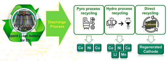 Because there are limited reserves of the rare metals found in spent LIBs [4], researchers are investigating the development of systematic and safe recycling systems. Thus far, three types of recycling methods for spent LIBs have been considered, namely the pyrometallurgy process, hydrometallurgy process, and direct recycling, as shown in Figure 1 [5]. The pyrometallurgy process is widely used for the commercial recovery of cobalt. However, it has the disadvantages of high carbon emissions and difficulty in recovering Li [6,7,8]. In contrast, the hydrometallurgy process is able to recover more Li and Mn than the pyrometallurgy process [9,10,11]; however, it generates large amounts of wastewater and contaminated acid fumes that can severely pollute the environment. In addition, the current important focus is on chemical facilities, research and industry pursuing sustainable and environmentally friendly processes and methods for the recycling of spent batteries [12,13,14,15,16]. Therefore, compared to the pyrometallurgy and hydrometallurgy processes, the direct recycling of batteries [17,18], especially from spent EVs, has gained significant attention as an environmentally friendly approach [19,20]. The discharging of spent LIBs is an essential process in the direct recycling of spent LIBs. This critical step prevents explosions, fires, and toxic gas emissions [21,22,23] that occur as a result of the inadequate sealing and short circuiting of high-energy LIBs. These explosions, fires, and toxic gas emissions can harm human health and the environment and damage the infrastructure necessary for recycling spent LIBs. If the spent LIB materials are damaged, their value for recycling and regeneration may be reduced [24]. The LithoRec project report describes the current discharge technologies used in the LIB recycling process [25]. The report briefly explains the several discharge technologies necessary for both safe and functional LIB recycling [26]. Two short-circuit-based discharge methods are widely employed, namely the resistor-based discharge, which connects both ends of the battery to consume the residual electric energy, and salt-solution-immersion discharge, which immerses the LIB in ionically conducting salt water to form a short circuit and thus effectively induce the electrochemical discharge of the LIB [27]. Among a variety of ionic salts, sodium chloride solutions have been widely used in typical chemical discharge processes [28,29]. Li et al. [30] analyzed the chemical components of wastewater from the salt-water discharge process. They detected “high” levels of aluminum and iron and “moderate” levels of cobalt, lithium, copper, calcium, and manganese. In addition, considerable amounts of zinc, barium, and vanadium were also detected. High concentrations of P were also observed, indicating that the corrosion of the metal collectors and sealing compartments caused electrolyte leakage (i.e., LiPF6). Moreover, metal hydroxides, salts, and metal oxides were also present in the wastewater. Thus, a suitable discharge technology must be developed to prevent the salt-water discharge from damaging the LIB and active materials, which will result in increased costs and additional steps in the recycling process. A potential solution to ensure the safe and effective recycling of spent LIBs from EVs is the electrical discharge method. However, to date, there has been a significant gap in the literature regarding research on the electrical discharge method for spent LIBs. This lack of research hinders the development of appropriate disposal methods for spent LIBs and presents potential environmental and safety hazards. Therefore, research is needed to investigate the electrical discharge method and its effectiveness for the safe disposal of spent LIBs from EVs.