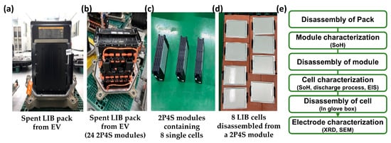 Photographic images of (a) the spent LIB packs from the EV, (b) 24 2P4S modules in the LIB pack, (c) 2P4S modules, (d) single LIB cells disassembled from a 2P4S module, and (e) experimental flowchart.