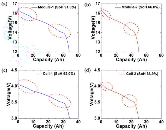 Figure 4 shows the SoH estimation of the spent LIB pack modules and cells recovered from two vehicles. As mentioned in the experimental section, the spent LIB packs were recovered from operating Renault Samsung SM3 ZEs. The modules and cells were prepared before measuring the SoH of the spent LIB packs retrieved from the two vehicles with different periods of use. The battery packs were disassembled into modules and cells, as shown in Figure 2. The LIB pack used in the SM3 EV contained 24 2P4S modules. Based on the specifications, the capacity of the module unit at 100% SoH was 74 Ah. The capacity of the cell unit at 100% SoH was 37 Ah owing to the 2P4S connection of eight cells. The SM3 ZE vehicles with different periods of use were designated 1 and 2, and the recovered modules and cells were numbered 1 and 2. Thus, the module and cell recovered from Vehicle no. 1 were labeled module-1 and cell-1, respectively, and the module and cell recovered from Vehicle no. 2 were labeled module-2 and cell-2, respectively. Figure 4a shows a graph of the discharge profile of module-1. The discharge capacity of module-1 was 67.9 Ah. This corresponded to a SoH of 91.8%. A sudden voltage decrease during the discharge process was not observed. However, two changes in slope during the discharge process were observed. These changes in slope are attributed to the redox coupling of different types of transition metals. Even though the proprietary information of the cathodes was unavailable, the cathode materials used were presumed to be LiNixCoyMn1-x-yO2 (NCM) or a blended composition of NCM and LiMn2O4. Blended cathode materials have previously been developed as a part of the cathode material design method for hybrid, plug-in hybrid, and battery EVs (HEVs, PHEVs, and BEVs, respectively) [35,36,37]. A blended cathode is composed of two or more distinct active material compounds [38]. Numerous studies have reported on the intricate behavior related to Li insertion and extraction kinetics in blended systems [36,39]. When two or more parent cathode materials are physically mixed, they affect the cell state of charge and Li diffusion properties and play a role in coulombic capacity during the cycling process. As a result of these unique characteristics, blended cathode materials are a topic of intense investigation. Figure 4b shows a graph of the discharge profile of module-2. The discharge capacity of module-2 was 49.4 Ah, corresponding to a SoH of 66.8%. In module-2, similar changes in slope were observed during the discharge process. Figure 3c shows the discharge profile graph of cell-1 disassembled from module-1. The discharge capacity of cell-1 was 34 Ah, corresponding to a SoH of 92%, similar to module-1. Figure 4d shows the discharge profile graph of cell-2 disassembled from module-2. The discharge capacity of module-2 was 24.8 Ah, corresponding to a SoH of 66.9%. The difference in SoH between module-1 and module-2 and between cell-1 and cell-2 indicated that the LIB performance varied depending on the operating conditions of EV.