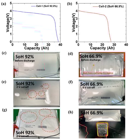 Figure 5 shows the results of discharging the cells to 0 V. Figure 5a shows the discharge profile graph of cell-1 to 0 V. No voltage changes or anomalies owing to side reactions were observed, and the discharge capacity was 38.3 Ah, higher than that shown in Figure 4c. Figure 5b shows the discharge profile graph of cell-2. The discharge capacity of cell-2 was 27.3 Ah. Both cell-1 and cell-2 were discharged from 4.15 V to 0 V, and bulges on cell-1 and intensive swelling on cell-2 were observed. Because the cells were discharged to 0 V, the temperature outside the pouch cell rose to a maximum of 43 °C for both cell-1 and cell-2. Figure 5c,d show photos of the initial state of 4.15 V. Cell-1 (92% SoH) appeared as the initial manufacturing state, and volume expansion was not observed (Figure 5c). Cell-2 (66.9% SoH) had the appearance of swelling, as indicated in Figure 5d, and the exterior of the cell-2 pouch was deformed similar to the shape of the cell holder in the module case. The discharge process was then performed on the cells to 2 V (cut-off). Bulges started forming when the discharge potential reached approximately 2 V (Figure 5e). In cell-2, slight swelling had already progressed, as shown in Figure 5d in the initial state. The bulges enlarged as cell-1 reached the discharge potential of 0 V (Figure 5g). Accordingly, cell-2 (66.9% SoH) exhibited more severe swelling, as shown in Figure 5f. It is worth noting that the intensive swelling of the cell-2 pouch smoothed out the deformation and wrinkles on its surface. The swollen pouch could not be reassembled into the module. We speculate that discharging the cells to 0 V for recycling may cause severe hazards if the cells are installed and fixed in the module or pack. The volumetric expansion of the cell in the module would lead to an explosion or ignition, which would threaten the safety of researchers and could damage the recycling equipment. The cell’s resting potential was measured by using a multimeter after discharging cell-2 to 0 V. As shown in Figure 5h, the resting potential was 2.689 V after resting for 24 h, thus exhibiting the most stable potential difference between the cathode and anode materials. Therefore, we determined that 2.5 V is an appropriate cut-off potential for the discharge.