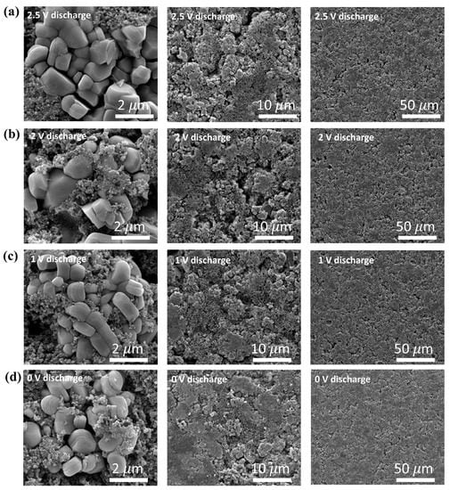 Figure 6 shows SEM images of the recovered cathode discharged to different voltages. According to the SEM images of the microstructure, no anomalies were observed on the surface. Although the electrodes were discharged to each cut-off voltage of 2.5, 2, 1, and even 0 V, no significant cracks or detachments were observed in the electrode layer composed of the active materials and carbon black used as the conductive agent. The discharge process for battery recycling did not significantly change the structure of the electrode layer despite the swelling of the battery. Thus, we cautiously speculate that the swelling of the battery owing to over-discharge to 0 V may result from the decomposition of the electrolyte in spent batteries.