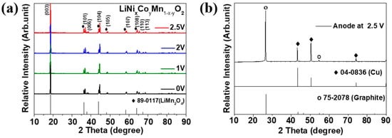 Figure 7 shows the XRD results on the recovered electrodes discharged to each voltage. Figure 7a shows the XRD results of the recovered cathode. No secondary phase was observed at 2.5, 2, 1, and 0 V. Even when cell-2 was discharged from 2.5 V to 0 V, no change in the crystal structure of the cathode material was observed. Thus, the damage to the cathode material is not strongly attributed to swelling. We speculate that blended materials of layered and spinel structures might be used for cathode fabrication. Blended cathode materials have been extensively researched and applied to HEV, PHEV, and BEV. Figure 7b presents the XRD results of the anode discharged to 2.5 V. We examined the Li compound in the anode after cell discharge to 2.5 V was completed. Compounds of Li were not observed, whereas peaks of graphite (anode material) and Cu (current collector) were observed. This demonstrates that there was no Li in the anode even after discharging to 2.5 V. Accordingly, the XRD results in Figure 7 and SEM results in Figure 6 indicate that no critical problems occur in the crystal structure and microstructure changes of the electrode, even when the electrode is discharged to 0 V.