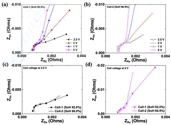 (a,b) Nyquist plots measured from cell-1 and a cell-2, discharged to various potentials, respectively. (c,d) Comparison of the Nyquist plots of cell-1 and cell-2, discharged to 2.5 and 0V, respectively.