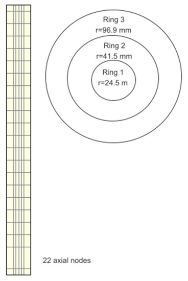 The 22 axial levels are assigned to the corresponding control volumes; 1 control volume is always common for the 2 middle rings and the other is assigned to the 3rd unheated ring. The other control volumes are used as media sources for the system and as a cooling circuit. COR levels 6–15 are electrically heated. The electrical heating power was set according to the experimental data; see
