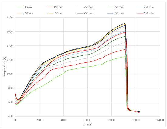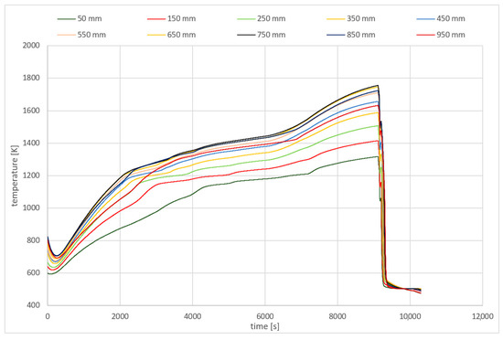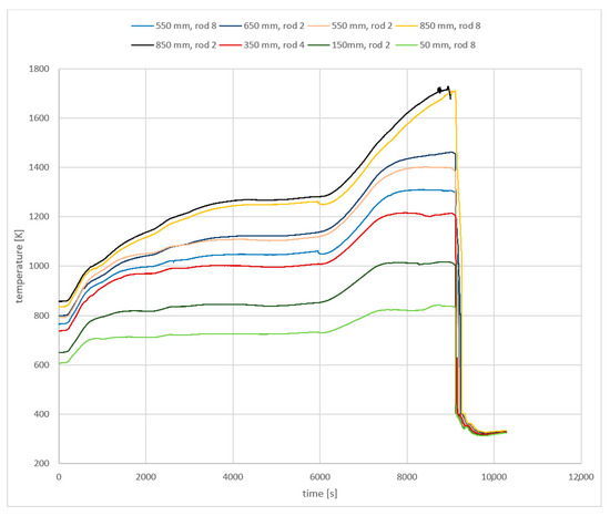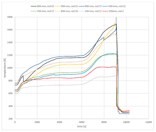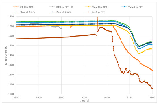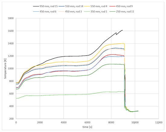 Figure 12. The experimental maximum of 1795 K at the height of 950 mm from the bottom of the heated part of the test bundle is not a trusted value because it is a single value that is unrealistically higher than the ambient values, as shown in