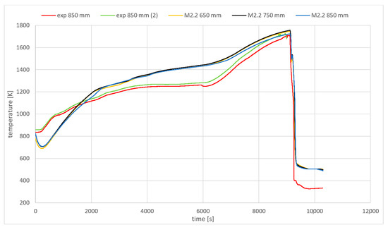 After the data cleaning, the experimental maximum of 1728 K was measured at a height of 850 mm from the bottom of the heated part of the test bundle. As shown in