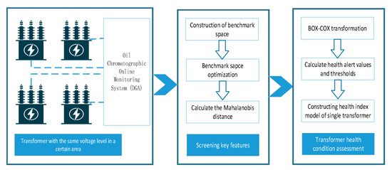 The data of the DGA online monitoring system of transformers used in this paper are all the data of power transformers of the same voltage level in a certain area, as shown in Figure 1. The external conditions are basically the same, and the influence of the external climate can be ignored. All the selected DGA online monitoring data are used to screen the key features according to the characteristics of the Mahalanobis–Taguchi system. Calculate the corresponding MD of the filtered features and calculate the overall alert value and the threshold value of all transformers. Finally, the HI curve of a single transformer is solved for the dynamic health assessment of the transformer.