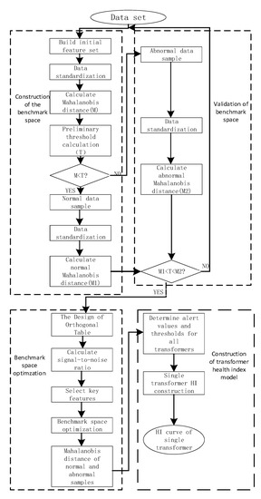 Since all DGA data are calculated when MD is calculated and its status cannot be distinguished by the whole data, the existing judgment results (normal (MDn), abnormal (MDa)) in DGA sample data are used to determine its threshold value. The maximum MD value corresponding to the normal state and the minimum MD value corresponding to the abnormal state in the DGA are used to calculate the screening threshold of the reference space, preliminarily screen the sample dataset, and form the reference space. The formula is as follows: