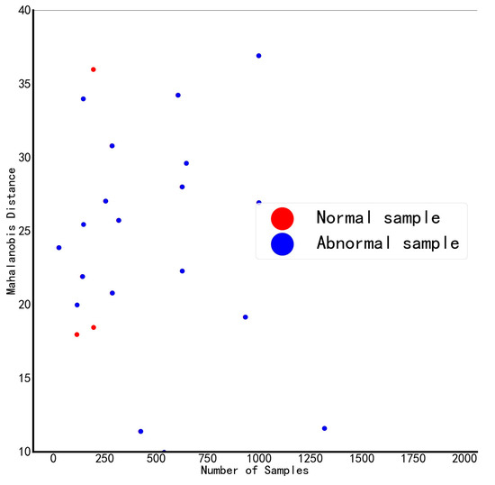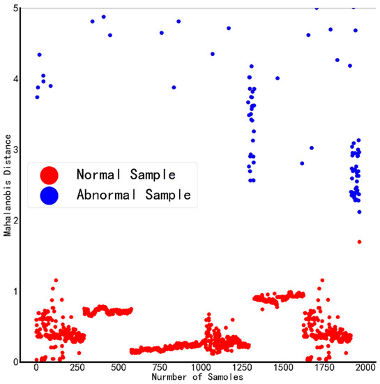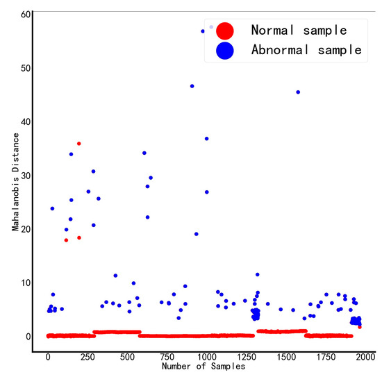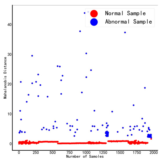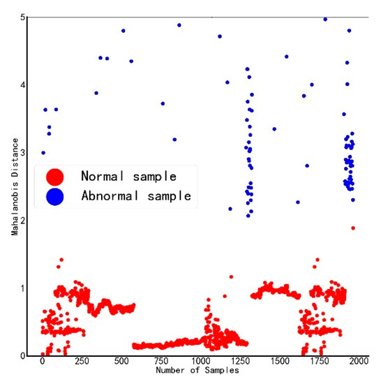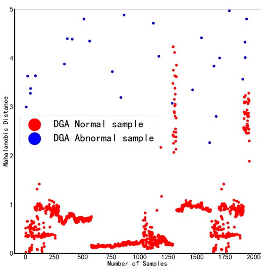 The selected five features are used as standard variables to construct the benchmark space, and the Mahalanobis distances of all samples are calculated after standardizing the data, as shown in Figure 3. The red dots in the figure represent samples judged as normal by the DGA device, and the blue dots represent samples judged as abnormal by the DGA device. The judgment results of the DGA device are partially normal, and the abnormal boundary is blurred, which is prone to misjudgment.