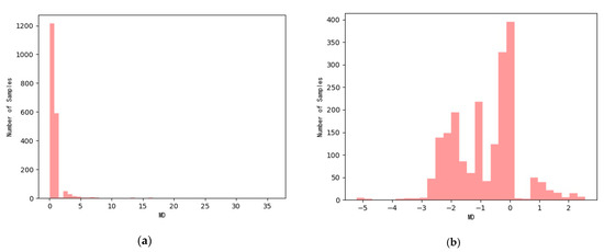 (1) According to Formula (11), use Box–Cox transformation to convert the MD value of normal samples into normal distribution or approximate normal distribution. Calculate the optimal transformation parameter λ = 0.013. The probability distribution before and after MD transformation is shown in Figure 9.