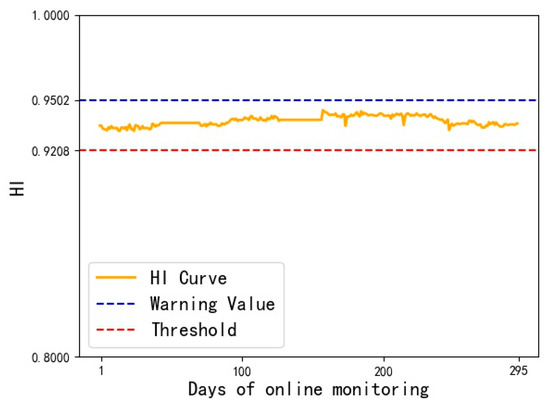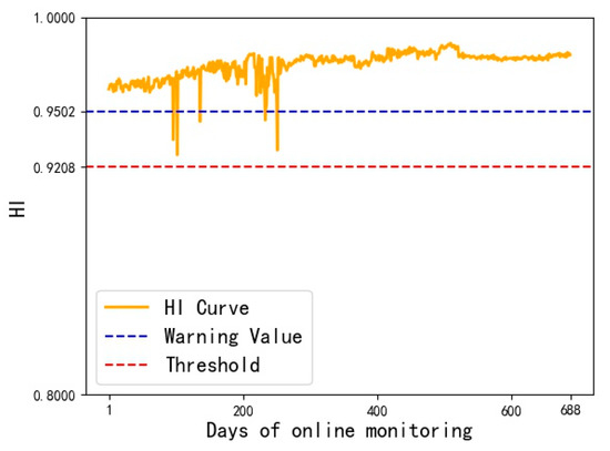 The warning value and threshold value of MD can be obtained from Formula (13), which are respectively T2σ = 0.9956 and T3σ = 1.5843. Then, the warning and threshold value can be calculated as HIw = 0.9502 and HIf = 0.9208, respectively, by Formula (14).
