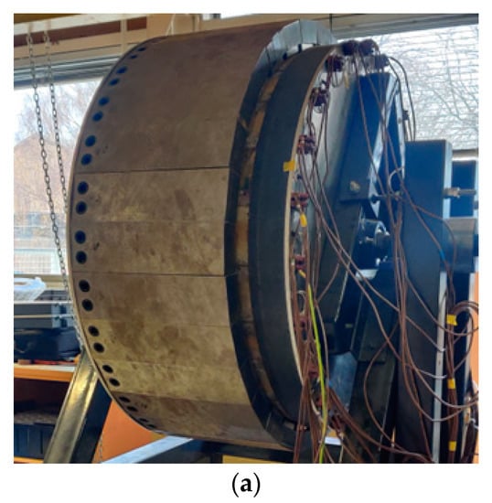 Figure 1a illustrates the C-Gen generator, a direct-drive, coreless, radial flux generator featuring a double rotor. It was developed specifically for wind energy harvesting applications. The absence of iron in the stator contributed to the machine’s overall low level of weight and lack of cogging torque at low speeds. The winding on the generator was constructed out of two series of connections, each of which was made up of four parallel branches from the same phase. These branches were connected to a 10-kW load, and the neutral line was left unconnected. For comparison, the machine was operated at the nominal speed of 100 revolutions per minute under healthy and faulty conditions. All coils were arranged in a non-overlapping, star-connected configuration. Figure 1b depicts a cross-section of the machine. Again, the comparison was carried out with the nominal speed set at 100 revolutions per minute, under various load conditions ranging from 1 kW to 10 kW. This machine was chosen because it demonstrated the harmonic cancellation mechanism discussed in [21].