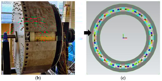 The tested C-Gen PM generator: (a) the real generator, (b) the generator with one magnet module removed, and (c) the FEA model of the machine with an arrow pointing at the faulty magnet.