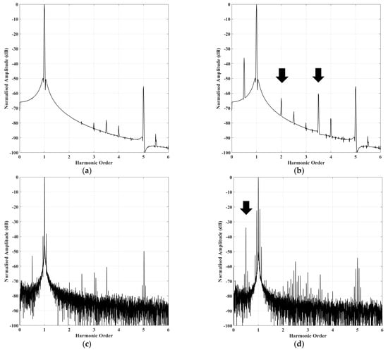 Simulation results. EPVA spectrum of the generator at 100 rpm: (a) healthy simulation; (b) local demagnetization simulation; (c) healthy experiment; (d) local demagnetization experiment.
