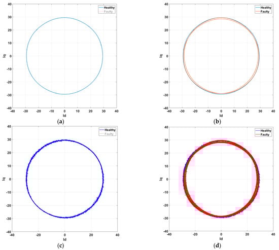 Park’s vector approach results were plotted in MATLAB using Equations (2) and (3). As shown in Figure 4, there were only minor differences in the loci of healthy and faulty cases. During a demagnetization fault, the loci radii grew smaller. Specifically, it was separated into three arc segments, with two arcs of varying radii separating each section. Figure 4 illustrates how loci could be utilized for fault identification. When the load level changed, the radii of the loci changed as well, but the asymmetrical distribution remained the same in the faulty generator, as illustrated in Appendix C and Appendix D. The main issue with this method was that it had low sensitivity to early faults and could have been influenced by other machine asymmetries. Therefore, an improved alternative should be examined.